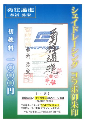 「第1戦 もてぎスーパー耐久」が行われる3月21日(土)より、新デザインに改めましたコラボレーション御朱印を授与します。